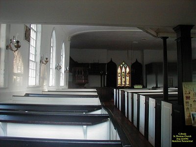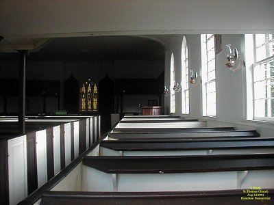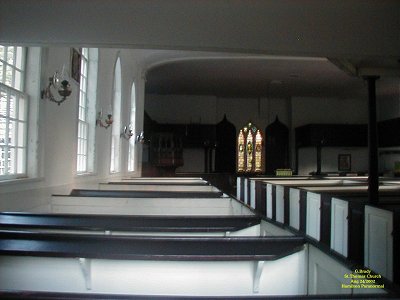 To see the full size image, click on the picture above. In this photo you will notice the way the pews were back in the period of this church. This alone would bring back memories of a time gone by. This is on the west side of the church where the sun would come in. As you can see from this picture, the window glass is clear and sheds an even light throughout the building.