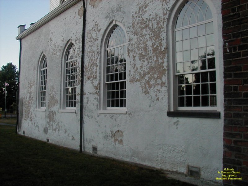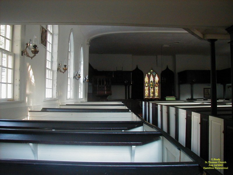 To see the full size image, click on the picture above. About two minutes later this photo was taken and the reflections on the wall have disappeared completely. This was strange in itself, but notice the faint red mist up at the front pew by the window. Also there is are faint red lines that go up by the windows. The only colored glass window in this church was at the back and the sun was not shining through the back. Nor does the back window have the same design features as shown in the reflections. We like to call this the reflections of times gone by and the spirits in this church in St. Thomas wanted us to see what the windows were like back in its time for some reason. St Thomas Church 2