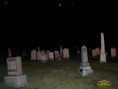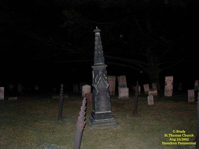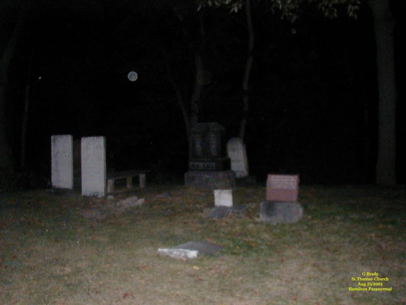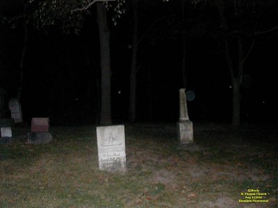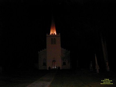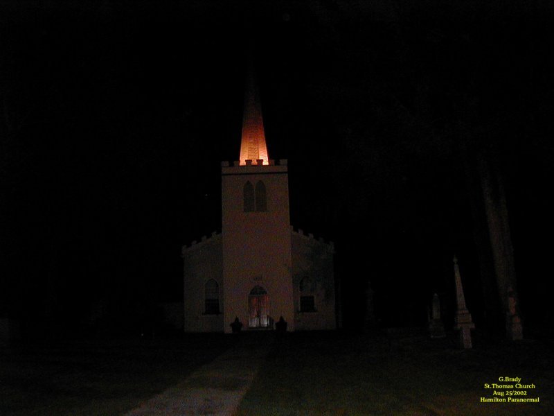 To see the full size image, click on the picture above. Just before we left we took this picture of the old church with its steeple lit up. There's nothing paranormal in this picture, but we will remember this church for a long time to come. For some reason the spirits here wanted us to capture what it was really like back in days gone by. This church has a story to tell and if I lived in this area I would do the history of this place and try to solve the puzzle of the windows the best I could. One thing is for sure, I will return to this place in the future. If you should ever be in St.Thomas Ontario and have a chance to see this place we are sure you wont go away disappointed.......Its worth the visit. St Thomas Church 2