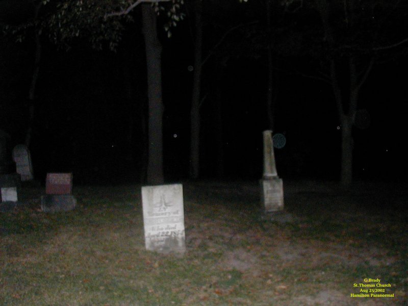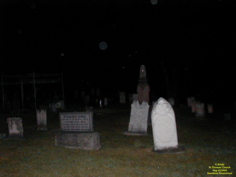 To see the full size image, click on the picture above. After touring some of the other haunted spots in St Thomas we returned to the cemetery to see what kind of night time shots we could get. Near the back of the cemetery was the most active for orb shots, however we did have an angel spirit with us that shows as a blue orb.