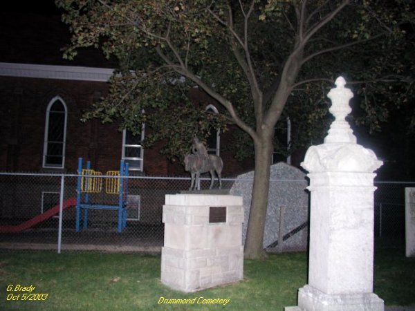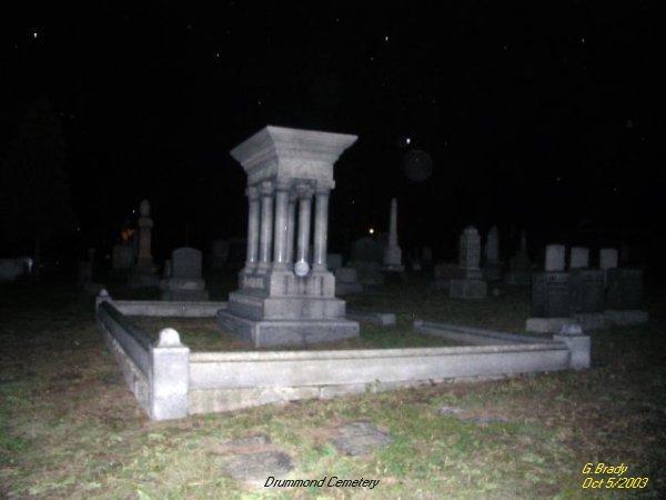 ![]() Niagara Falls, Ontario Drummond Hill is located at Lundy's Lane and Drummond Rd. near Clifton Hills in Niagara Falls. Legend has it that the British artillery had occupied the hill and was under the command of a Lieutenant General Gordon Drummond (he was a Canadian by birth,) from the war of 1812. At approximately 7:15pm on July 25th/1814 a General Winfield Scott had advanced his American troops up the hill to fight the British artillery to seize their guns. Gordon Drummond fought a very hard battle and many soldiers died in a battle that was described as one of the bloodiest battles on this hill. The battle went into a see-saw effect and just when the Americans thought they had won, the British regained the hill a little later on. By around 1am the Americans had retreated to Fort Erie and some went to the camps at Chippawa. The death toll reach approximately 1,700 men from both sides that had died in the battle and littered the hill that is known as Drummond Hill today. Some of the men died a more gruesome death under the saws of the 19th century surgeons in the field after the battle. Today it has been reported by the folks that live and work around the hill that they have seen ghostly soldiers from the war march up the hill. Some have even reported seeing balls of light zipping within the cemetery. Some claim to hear from time to time shouting, sounds of men running as well as what sounds like gun fire in the distance. Visitors and historians have reported similar things within the cemetery. The history that surrounds the cemetery on the hill known as Drummond Hill is a must see both for the visitor and paranormal researcher. When one enters the grave site it seems as though you have passed into a time long forgotten. The pictures that are shown in this investigation have what we believe to be real paranormal content. This of course is our OPINION ONLY. It is up to the individual to decide for themselves if what we had captured on camera is paranormal or not! All pictures taken were witnessed by those in attendance while they were still on the camera. With that said we hope you, the viewer, enjoy your visit to our site. Investigation #1 On October the 5th/2003 myself, Cathy, Chad and Cindy arrived at the Drummond Cemetery in Niagara Falls around 3am in the morning. Once we got out of our cars and headed for the main gate to the cemetery we could feel a cold spot and a feeling we were being watched. This was our first time at this location and I for one could not get over the immenseness of what had happened on this hill many years ago.... ![]() The very first picture I took was of the gate that leads into the cemetery and I was surprised to capture some activity at the gate. The next couple of pictures I took of the gate showed nothing. ![]() Once I had entered the cemetery I had a feeling of something watching me, complete with the spider web effect across the hands and face. I came upon this fenced portion of the cemetery with a huge tree sitting right in the middle. There were only a few headstones within the fenced area. Looking at the tree it came to mind that this tree was very old. Maybe 200 to 300 years old. The stories that this tree could tell..... ![]() I got to one side of the fenced area and could see something like a shadow moving within the area. I took this picture and got some strong ecto mist. ![]() Just a ways from this portion another fenced area that held an above ground crypt. All the while having a feeling of something or someone watching your every move..... ![]() Not too far away stood a very attractive headstone with pillars. As I had approached this area I could hear very faint bangs like that of gun fire in the distance. It made me look around for the others to ask them if they could hear what I had heard. Only thing is they were in another area. ![]() I took a few more pictures around this headstone and managed to capture some more ecto mist with energy to it covering some head stones. At the time the temp must have dropped 10 degrees. ![]() I took another shot in the same direction where I had captured the ecto mist. It seemed that I had caught it again but this time it appeared to be moving away to my right. ![]() I found this head stone by the church playground that I thought was very interesting.... Nothing of a paranormal nature to this photo but the stone itself was interesting, with a soldier on a horse.... Drummond Hill Page 2
