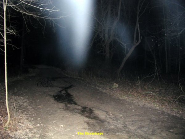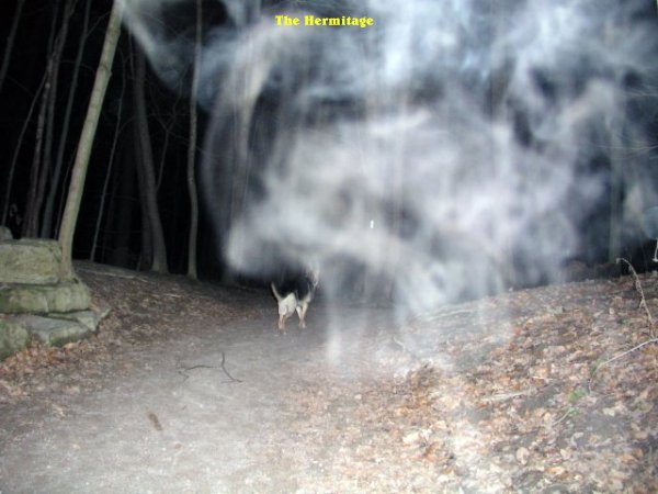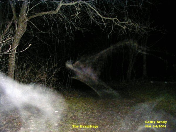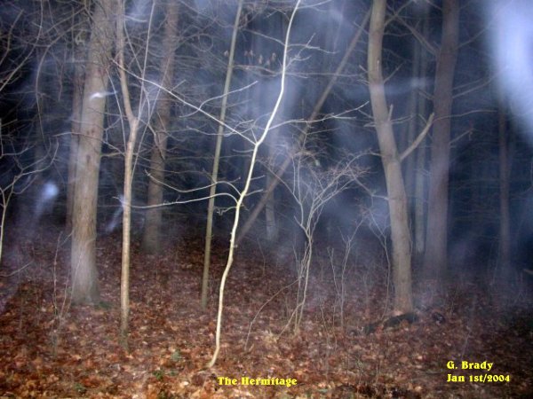 ![]() The pictures that are shown in this investigation have what we believe to be real paranormal content. This of course is our OPINION ONLY. It is up to the individual to decide for themselves if what we had captured on camera is real or not! All pictures taken were witnessed by those in attendance while they were still on the camera. With that said we hope you, the viewer, enjoy your visit to our site. Conditions: Clear Night This night was not a good one for me. We had gone to the Hermitage in hopes of getting good pictures tonight. However when we arrived (Cindy had followed us in her van) at the lower parking lot we got together and as always we turned our cameras on. When I did this I noticed that my card for the camera was not in the camera. It was still at home in the card reader.....OOPS!! I had to return home to get the card while the others carried on to the Hermitage......:( ![]() When I had returned and gotten out of the car I started to walk up the hill. It feels a little freaky, to say the least, going up the path by yourself. You hear everything that the surrounding woods has to offer. I got so used to going with people and traveling together as a group. I snapped off a few pictures, then got this one right in front of me. An ecto form that appeared to be forming from above to the ground. ![]() When I got about half way up the hill I could hear something running down the trail. It startled me a bit, until I realized it was Max. He was just about to meet me when he turned around almost on a dime and started to growl at something. As seen in this photo Max had good cause to growl. ![]() Almost at the top of the trail that leads to the back of the hermitage I took this picture showing what looks like someone or something hiding behind the tree to the left of the trail. This energy form was in ecto plasm. ![]() Cathy came down to meet me. She took some pictures in the area where I managed to capture something, then she caught this energy forming just ahead of us on the trail. ![]() I heard a low pitch moan coming from the woods to my left. Just after the moan came a sound of someone walking nearby in the woods. I took this picture and caught some activity in blue ecto plasm form with a lot of small wisps that seemed to be floating in and around the trees.