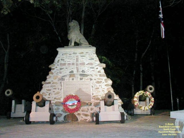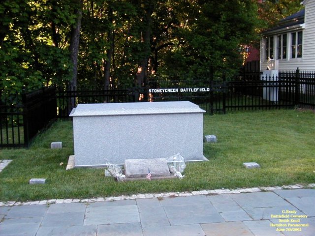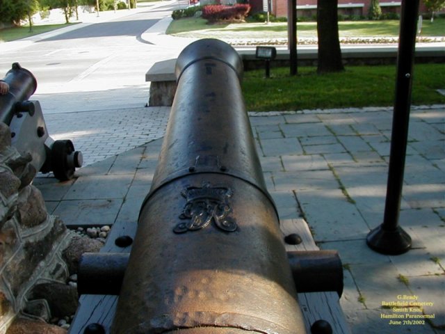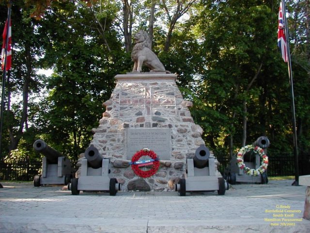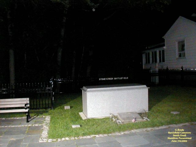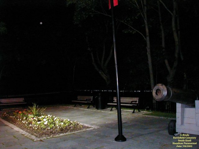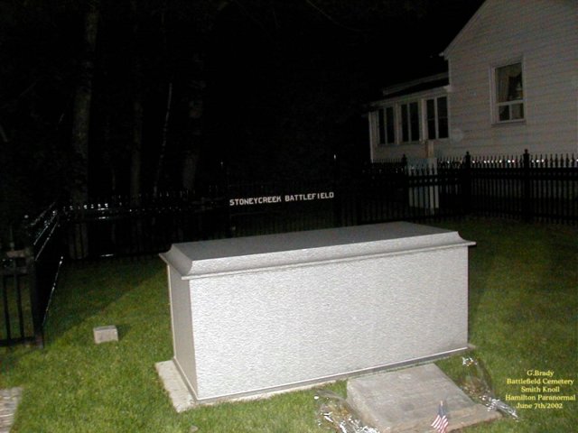 ![]() Stoney Creek Ontario Smith's Knoll that sits on the north side of King Street in Stoney Creek had a part in the Battle of Stoney Creek of the war 1812 but this did not come to light until 1889, 76 years after the battle had taken place. A young boy named Allen Smith was doing the ploughing of his father's farm. And in the field where he was ploughing he uncovered bits of bone and cloth with what appeared to be British and American military emblems. The young man ran back to the farm house to tell his father what he had discovered. After this was discovered, more digging was done which led to the discovery of 23 unknown soldiers bodies being found on the Smith's land. The area where the bodies of the soldiers were found is now known as Smith's Knoll. It was later discoverd that this was the place where the American guns had been placed during the battle.... As time went by Smith's Knoll became the site of the Battlefield Cemetery in Stoney Creek, Ontario. ![]() In 1998 the city prepared a unique plan to restore the downtown core of Stoney Creek and included in this plan was giving the Cemetery a face lift. Assistance for the Knoll came from the Millenium Bureau of Canada .... On June 4th/2000 at 11a.m. after the reconstuction of the Knoll it was ready to be re-opened to the public as a National Historic Site complete with a special re-dededication memorial service. ![]() At the re-dedication ceremony the remains of the 23 soldiers that were found on the knoll had been put into a wooden crate and then were put into a new crypt that was installed at the knoll. ![]() The soldiers remains were unearthed back in the summer of 1999 as a part for the new Millenium Project. Archaeologists that uncovered the bodies of the soldiers were unable to explain why most of the skulls of the soldiers were missing. They did confirm that the bones that were uncovered were that of British and American soldiers. Also they had found British Buttons and shot and many buttons from the Second Artillery Unit belonging to an American Unit..... It is believed that the soldiers would have been killed by other soldiers to end their suffering on the knoll during the Battle Of Stoney Creek..... Today Smith's Knoll is a monument to be proud of and a reminder of those that died in battle of the War of 1812..... ![]() A good picture to show the length of one of the cannons that were used back in the War Of 1812 by the British Army that now sits on the knoll. ![]() We had conducted a brief investigation at the Knoll and came up short of pictures, but here is a picture of the knoll as it stands today at night time. ![]() In the above shot you can see the new crypt where the bodies of those that were found on the knoll now rest in peace.There is a lone orb that hovers over the crypt. ![]() Another picture of the crypt at night on the knoll. Just to the right on the house that sits by the knoll a lone ORB stands by to see what we are up to. ![]() A picture of the flower garden that sits by the monument on the knoll with another lone ORB just above the garden. We plan on returning to the Knoll to conduct investigations in the future. The knoll is open to the public and its a great spot to visit.