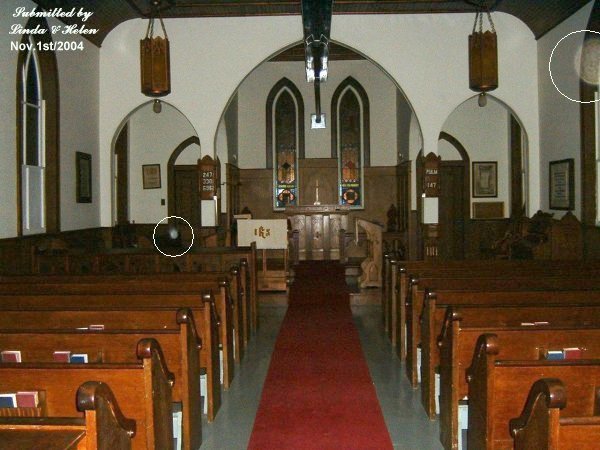 ![]() ![]() Above was a photo submitted by Linda and Helen of a church they attend. They had managed to capture an orb up near the front of the pews on the left side. And another up higher on the right. This photo was tested and the orb you see in the back had a green energy to it while the one up closer had a red energy to it.