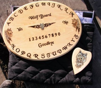![]() ![]() The Wolf Board is a new design we thought to be interesting. An oval shaped Spirit Talking Board showing wolves both on the board and planchette. $75 (Price includes carrying/storage bag and planchette.) The Basswood we use is noted as an exotic wood that cannot be found in your regular lumber outlets. Basswood has to be ordered from an exotic wood dealer..... What is best about it is that it is lightweight and easy to work with and the finished product has a uniqueness all of its own. Each board is made of 3/4 inch basswood or pine, and hand sanded before being burned and colored. Each planchette is made of 3/4 inch pine complete with wooden legs. Each board & planchette has a wood sealant put on before the varnish. Each coat of varnish that is put on the board & Planchette is hand sanded for smoothness. All boards & planchettes have 4 coats of varnish to give a high gloss effect. This will ensure that all hand crafted images on the board & planchettes will be preserved for a long time to come. All boards come with a black padded carrying case. Inside the case is a pocket to keep your planchette from scratching your board. All cases are made from a soft black quilted material, complete with a handle for carrying your board from place to place or storing your board till your next reading...... We can also create a customized board for you with your own designs on the board. All boards are 12X16 working space, outside measurements are 12.5 X 16.5.
