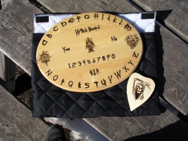 ![]() ![]() The Witch Board is a gothic style board that is sure to raise a few eyebrows. It is unique with the layout designs on the board, and can make a great conversation piece at your next session of contacting the spirits. $75 (Price includes carrying/storage bag and planchette.) The Basswood we use is noted as an exotic wood that cannot be found in your regular lumber outlets. Basswood has to be ordered from an exotic wood dealer..... What is best about it is that it is lightweight and easy to work with and the finished product has a uniqueness all of its own. Each board is made of 3/4 inch basswood or pine, and hand sanded before being burned and colored. Each planchette is made of 3/4 inch pine complete with wooden legs. Each board & planchette has a wood sealant put on before the varnish. Each coat of varnish that is put on the board & Planchette is hand sanded for smoothness. All boards & planchettes have 4 coats of varnish to give a high gloss effect. This will ensure that all hand crafted images on the board & planchettes will be preserved for a long time to come. All boards come with a black padded carrying case. Inside the case is a pocket to keep your planchette from scratching your board. All cases are made from a soft black quilted material, complete with a handle for carrying your board from place to place or storing your board till your next reading...... We can also create a customized board for you with your own designs on the board. All boards are 12X16 working space, outside measurements are 12.5 X 16.5.