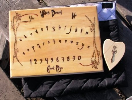 ![]() ![]() This board is adorned by two Chinese dragons and a dragon dagger on the planchette. It is sure to please the dragon enthusiast in your life. $75 (Price includes carrying/storage bag and planchette.) The Basswood we use is noted as an exotic wood that cannot be found in your regular lumber outlets. Basswood has to be ordered from an exotic wood dealer..... What is best about it is that it is lightweight and easy to work with and the finished product has a uniqueness all of its own. Each board is made of 3/4 inch basswood or pine, and hand sanded before being burned and colored. Each planchette is made of 3/4 inch pine complete with wooden legs. Each board & planchette has a wood sealant put on before the varnish. Each coat of varnish that is put on the board & Planchette is hand sanded for smoothness. All boards & planchettes have 4 coats of varnish to give a high gloss effect. This will ensure that all hand crafted images on the board & planchettes will be preserved for a long time to come. All boards come with a black padded carrying case. Inside the case is a pocket to keep your planchette from scratching your board. All cases are made from a soft black quilted material, complete with a handle for carrying your board from place to place or storing your board till your next reading...... We can also create a customized board for you with your own designs on the board. All boards are 12X16 working space, outside measurements are 12.5 X 16.5.