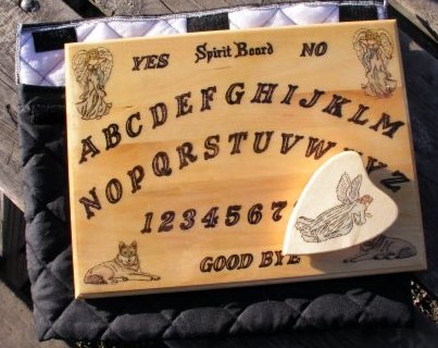 ![]() ![]() This board was custom ordered with angels and wolves on it. The planchette also has an angel adorning it. $75 (Price includes carrying/storage bag and planchette.) The Basswood we use is noted as an exotic wood that cannot be found in your regular lumber outlets. Basswood has to be ordered from an exotic wood dealer..... What is best about it is that it is lightweight and easy to work with and the finished product has a uniqueness all of its own. Each board is made of 3/4 inch basswood or pine, and hand sanded before being burned and colored. Each planchette is made of 3/4 inch pine complete with wooden legs. Each board & planchette has a wood sealant put on before the varnish. Each coat of varnish that is put on the board & Planchette is hand sanded for smoothness. All boards & planchettes have 4 coats of varnish to give a high gloss effect. This will ensure that all hand crafted images on the board & planchettes will be preserved for a long time to come. All boards come with a black padded carrying case. Inside the case is a pocket to keep your planchette from scratching your board. All cases are made from a soft black quilted material, complete with a handle for carrying your board from place to place or storing your board till your next reading...... We can also create a customized board for you with your own designs on the board. All boards are 12X16 working space, outside measurements are 12.5 X 16.5.