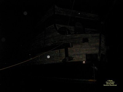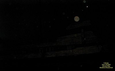![]() Below you'll see more of the pictures we took with our digital camera. You decide for yourself if we saw a ghost or not. ![]() To see the full size image, click on the picture above. As the light of day began to fade, giving way to the night, we all felt goosebumps start to rise as we stood near the ship. I moved toward the front of the ship to take this picture and was surprised to get these ORBS hanging around it. Is the ship really haunted, or is it just a resting place for spirits in their journey to other places????? ![]() To see the full size image, click on the picture above. Another picture of the ship at a different angle. Some big orbs are at the front of the ship, and it appears they were posing for us to let us know we were not alone..... ![]() To see the full size image, click on the picture above. At about 9:35 pm I took this picture from the side of the ship. We caught a very bright orb in this photo, and a few others as well. ![]() To see the full size image, click on the picture above. Again another fully charged orb seems to be hanging around near the front of the ship.