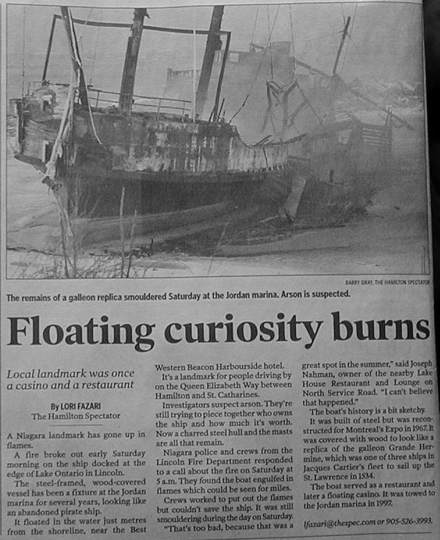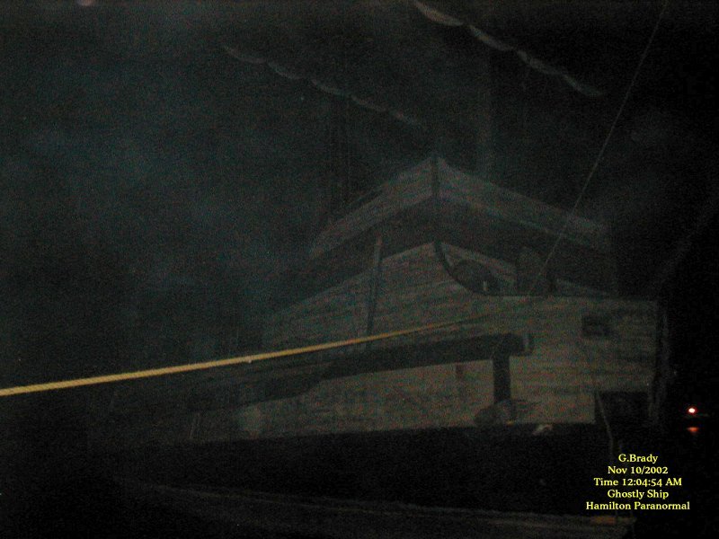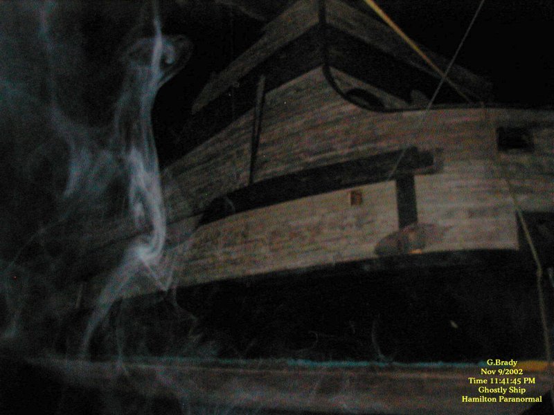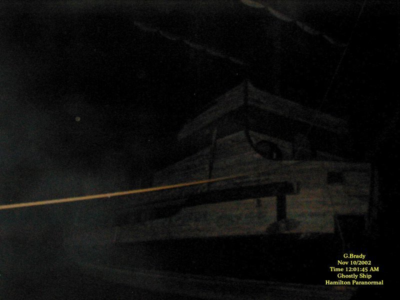 ![]() November 9, 2002. A clear, still and unusually warm night for this time of year. On our return trip from the investigations we'd been doing at the blue tunnel and the screaming tunnel we decided to stop at the old ghostly ship in Jordan. Along for the trip were Cathy, our two boys, Judith (a relatively new investigation participant) myself and Lady (our ghost hunting dog). When we pulled into the parking lot near the ship it was totally empty. As the lights of the car moved across it, we noticed that the ship seemed to be leaning more than it had on the previous trip. When we got down near the ship we realized that the water level had dropped several feet since our last visit. ![]() To see the full size image, click on the picture above. In this photo I felt something was very near and I was right. You can see some sort of ecto mist going along the water and up by the side of the ship. ![]() To see the full size image, click on the picture above. I got a few orbs here and there in the next few pics. Then approximately 20 minutes later I caught what appears to be more ecto mist. It seems we had company that wanted to show themselves. ![]() To see the full size image, click on the picture above. In the next shot I got nothing, but in this shot 3 minutes later more ecto mist. Is this ship trying to show me something????? After taking about 36 pictures of the ship there was nothing else spectacular to really report outside of these 3 shots. We dont know the history of this fascinating old ship, but we do urge you if you ever make it by the Jordan Harbor, to stop by and take a look. It is definitely a site to see. I am sure if you drop in and see it, you too will come away with many ideas of where it has been and what adventures it must have seen while it was in service. As to the question of whether it is haunted or not, who knows for sure. You will have to draw your own conclusions on this one. But there does seem to be a lot of paranormal activity here. And it is well worth the visit. ![]() To see the full size image, click on the picture above. The Old Pirate Ship that was at the Jordan Harbor, Lincoln County along the QEW heading towards Niagria Falls burnt down around 5am on Saturday Morning January 25th, 2003. Arson is suspected in the tragic end of this tall ship replica. The ship was known as the Gallen Grande Hermine. We were happy to have the pictures of this historical ship before the fire gutted her. It is sad that she is gone, but she will live on in our memories and in our pictures. ![]() Ghostly Ship Page 1 Ghostly Ship Page 2 Ghostly Ship Page 3 ![]() ![]() ![]() |