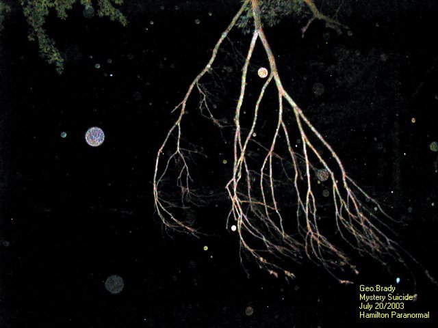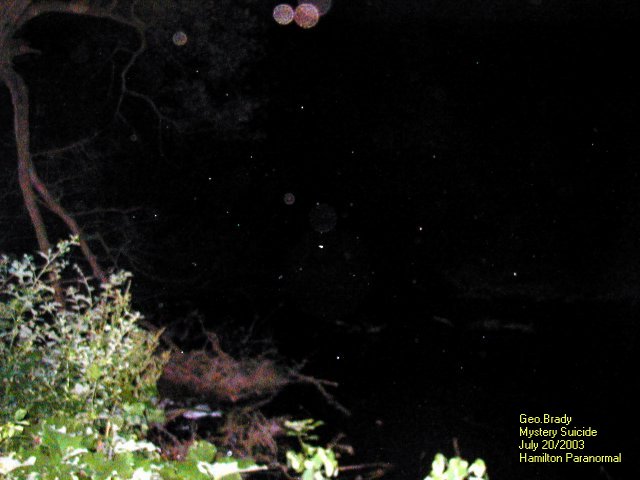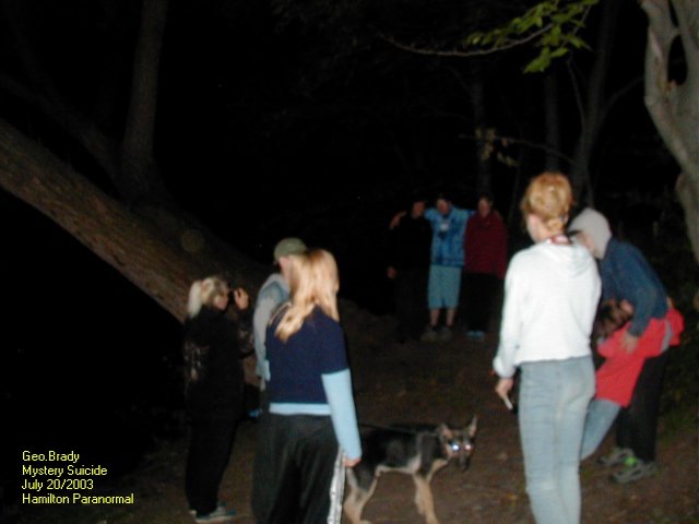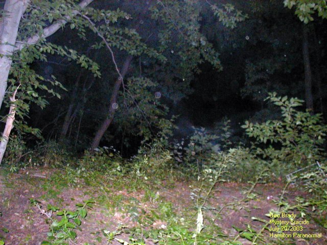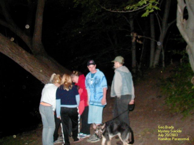 ![]() In the year 2002 on a warm summer morning a young man was discovered hanging from a tree over a small creek in Simcoe Ontario. The body was discovered by a man walking his dog along the trails that run off of Oakwood Drive. Local teenagers have reported hearing strange noises along with an unsettling feeling when they pass this area. Also it has been reported that many bad things happen on the trail in the evening such as muggings and rape. It has been hinted at that even the police will not enter the trail unless they have back up. As for the young man that was found hanging from a tree that reaches over the small creek, it has not been determined if the young man had hung himself or if he was murdered. The young man was well known to the local teens in the area and most agree that he did not hang himself... I had the invite to talk to the teenagers that live in the area and was filled in on the account of this hanging. Some of the teens were invited to my nephew's birthday party (Matthew Doek) who does not live too far from where the hung man was discovered. After I had talked to the teens a group of us went out to the spot where the body was found. On the way along the trail I would have to agree with the teens that indeed there was a presence of some sort, complete with cold spots and warm spots. Once the group reached the area I gazed at the tree for a few minutes and told the group to let me know when they saw or felt anything unusual, then we would start to take some pictures in the area. As the group waited and tuned in to the surroundings some had seen a shadow of a slender man standing nearby on the trail watching. Then the shadowy figure would move about on the trail and then was spotted across the creek. Cathy and I both saw what the others had seen and we were sure that indeed we were not alone... The night sky overhead was very clear with many stars and there was almost a dead eerie silence that blanketed the area. There was no wind at all. Some of the teens started to feel the temperture drop and the leaves on the tree started to move. I got ready with my camera as did Cathy and we started the photo shoot...... ![]() Once we all reached the tree that hung over the creek everyone was feeling a little uneasy. The tree itself was one pictured from a horror movie. When the leaves started to ruffle I took this shot of the branch where the young man was found hanging. The ORB in the picture was on the branch in question. ![]() After taking a few more pictures everyone heard a faint cracking sound up in the tree. I then took this picture and managed to get a bit of ecto around the branch's along with some orbs. ![]() Cathy and a few others spotted a dark figure of a person up on a small hill behind me. Cathy tried to take a picture but her camera would not let her take the picture. So I clicked off one and got a bit more ecto mist on the hill. ![]() The young lady (Chelsea) in the white top knew the young man that was found hanging from the tree. I took a picture where she was standing and got ecto plasm that seemed to be going towards her. When I had taken the picture I could see through the view finder the ecto that shows in the picture. At this point everyone noticed a change in temperature. Jori had thought that the mist that was going for the group was that of an angel. ![]() After taking many more shots I kept this one for the ORB in the picture was fully energized with vibrant color. ![]() At the time this photo was taken I had felt a slight heavy feeling on my chest. As one can see there were three orbs in the top portion of the picture. Red is not good and could be of a spirit that was angry. It could also mean a demon of some nature was in the area. ![]() Nothing really of a paranormal nature in this picture. Part of the group that was with us this night. Cathy on the far left, Rose , our son Matthew, our new shepard MAX, Chelsea, Cindy and Daniel. In the background is our nephew Matthew, our niece Jori and the boy in blue was Rob. ![]() Some orbs around the group at the base of the tree where the body was found. ![]() Simcoe Trail Page 1 Simcoe Trail Page 2 ![]() ![]() ![]() |